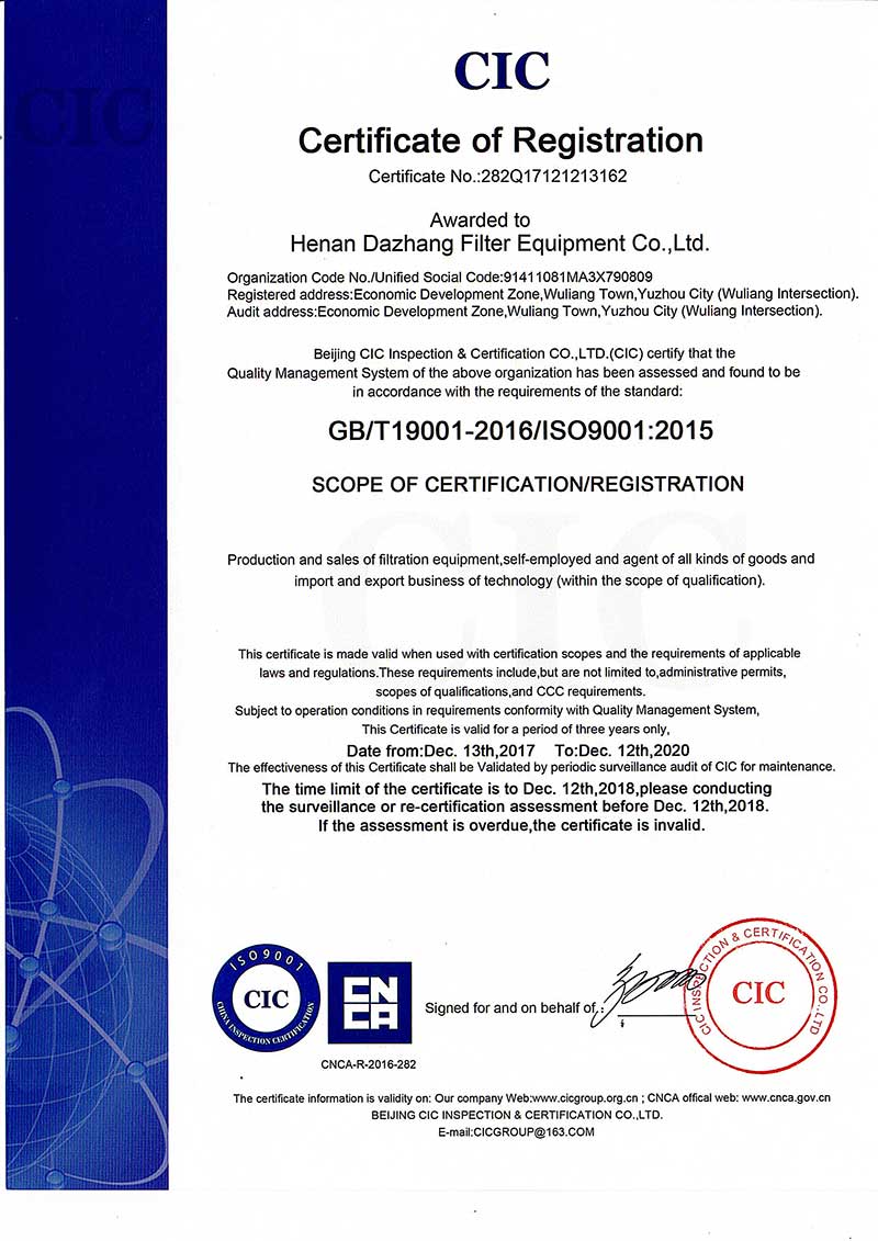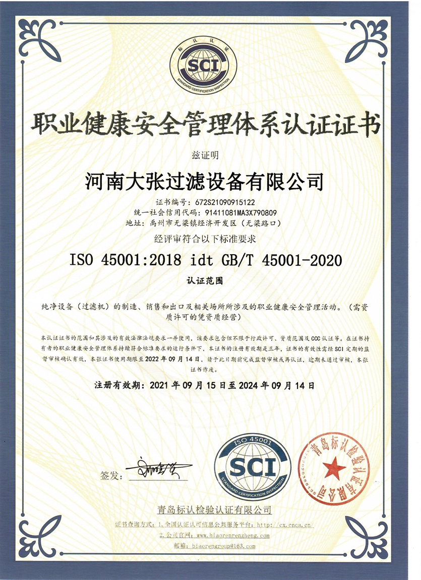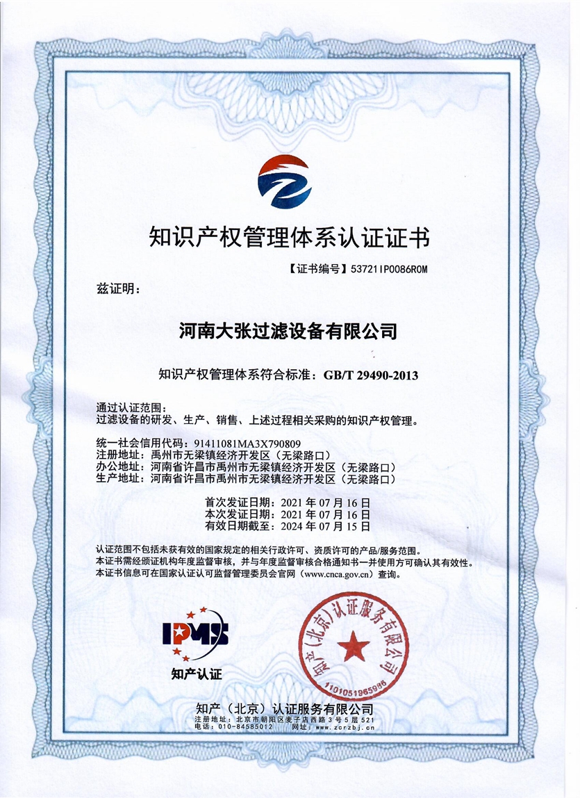河南大張自成立以來,堅持以質量求生存、以信譽求發展,先后通過了質量管理體系、環境管理體系、職業健康安全管理體系及知識產權管理體系的認證,河南大張及關聯公司先后獲得了“國家級高新技術企業”、“國家級第三批專精特新小巨人企業”、“國家級兩化融合管理體系評定證書”“河南省技術創新示范企業”、“河南省節能減排科技創新示范企業”、“河南省優秀科技型企業”、“河南省文明誠信企業”、“河南省名牌產品”“河南省工業設計中心”“許昌市市長質量獎提名獎”等稱號。公司始終堅持創新力求發展,技術改變世界,取得令人矚目的成果。2013年研發的“免加工密封式方形聚丙烯濾板”打破了中國市場被歐洲壟斷的局面;2015年成立的“河南省新型固液分離裝備工程技術研究中心”,是河南省一家從事固液分離裝備技術開發和應用的專業機構;2017年成立的“河南省企業技術中心”證實了公司科技創新的實力和水平,2018年“高分子隔膜濾板智能自動化混料體系研發與產業化”、2019年“環保行業專用壓濾機的濾板關鍵技術研發及產業化”相繼被列入許昌市重大科技專項項目;2020年公司董事長張振利榮獲“全國優秀農民工”稱號。該年度公司被河南省科技廳認定為“河南省高分子濾板先進材料工程技術研究中心”,參與制定壓濾機方面的團標3件,修訂國家標準1件。其相關技術在國內處于優勢。2021年公司被河南省科技廳評為“河南省瞪羚企業”榮譽稱號。隨著實力的不斷增強,公司成為中國通用機械工業協會分離機械分會副理事長單位,同時為滿足市場上對壓濾機產品的需求。