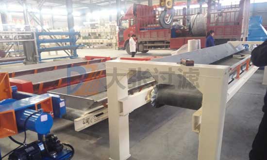 水平輸送機(jī)至于壓濾機(jī)底部,采用可承重橫梁,增加導(dǎo)泥裝罝,重型支腿,可以把壓濾機(jī)直接放置在輸送機(jī)上。