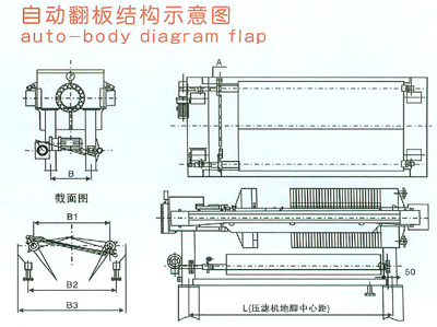 壓濾機濾板下方裝置了兩塊協(xié)調(diào)工作的翻板,在過濾過程中處于閉合狀態(tài),將滴漏的液體或濾板沖洗水導入兩側(cè)的集液槽。卸料時處于開啟狀態(tài),起到導泥作用。